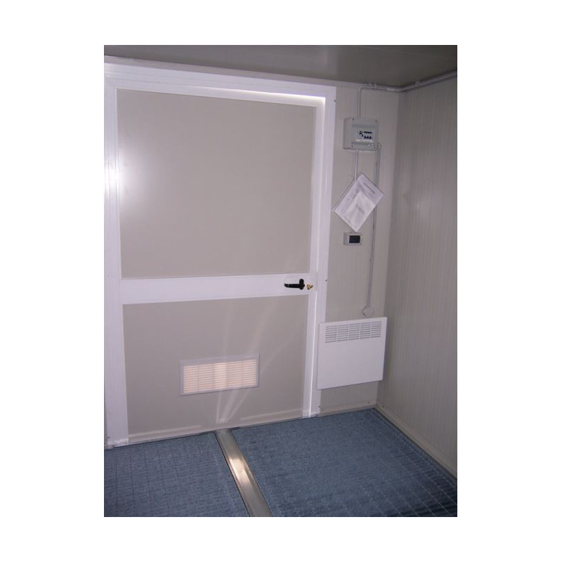 Le Bungalow phytosanitaire est équipé d’une porte pleine dimensions 134 x 220 cm (120 cm de passage) isolée, avec 1 grille d’aération en PVC dimensions 50 x 23 cm.