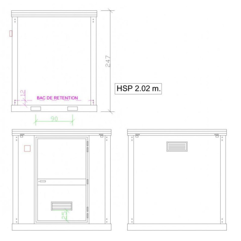 Le Bungalow phytosanitaire est constitué d’une ossature en acier galvanisé et laqué couleur gris Clair RAL 9002.